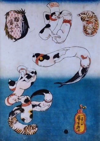 猫の当て字(猫文字)は、江戸時代の浮世絵師・歌川国芳が猫のポーズで文字を形作ったユニークな作品群です。