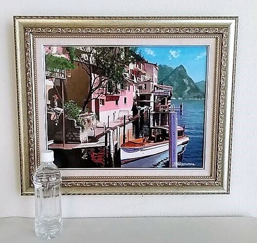 中河原英之「ルガノ湖のレストラン」 油彩画 額縁外寸54.0x45.5x4.5㎝ 絵41.0x31.8㎝ 張キャンバスF6サイン右下[k-053]