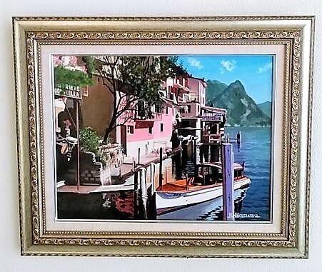 中河原英之「ルガノ湖のレストラン」 油彩画